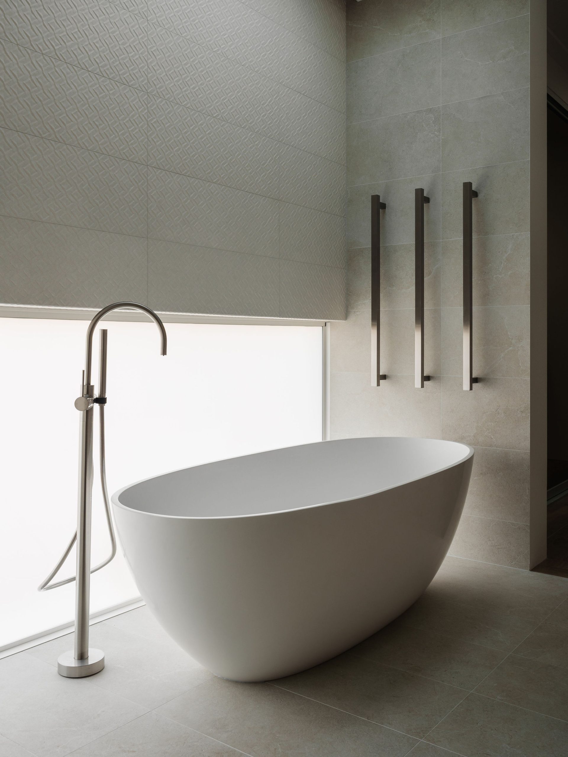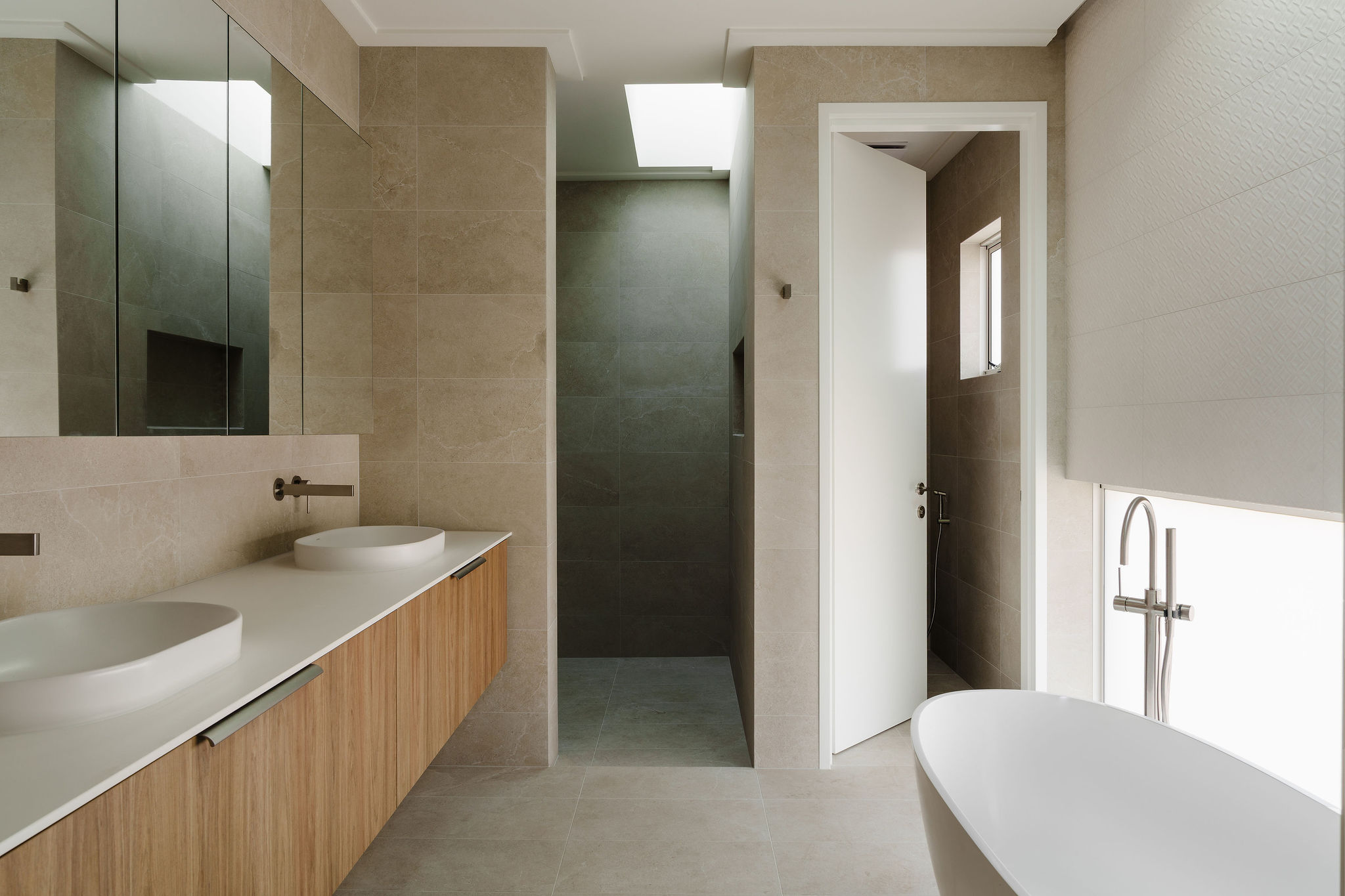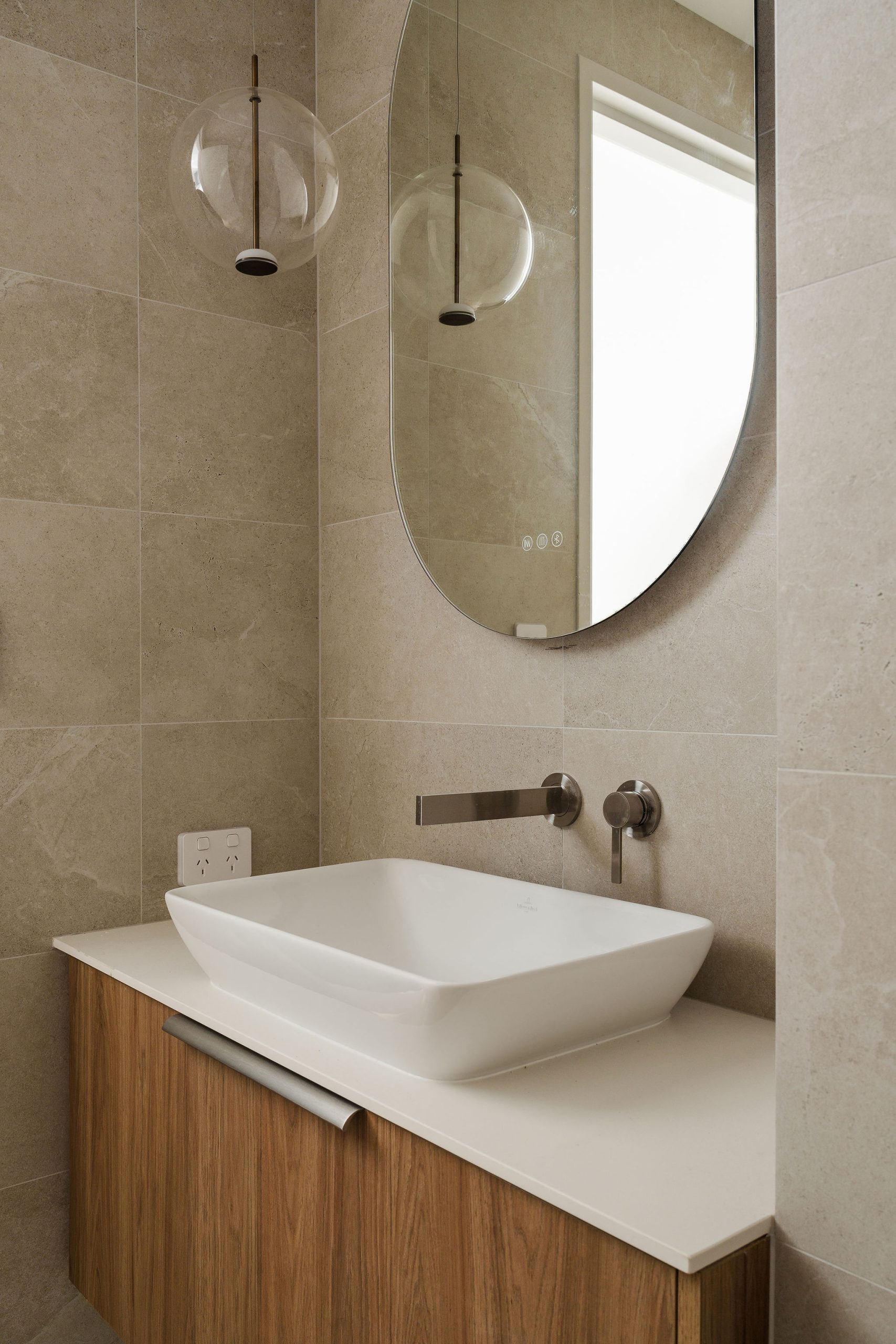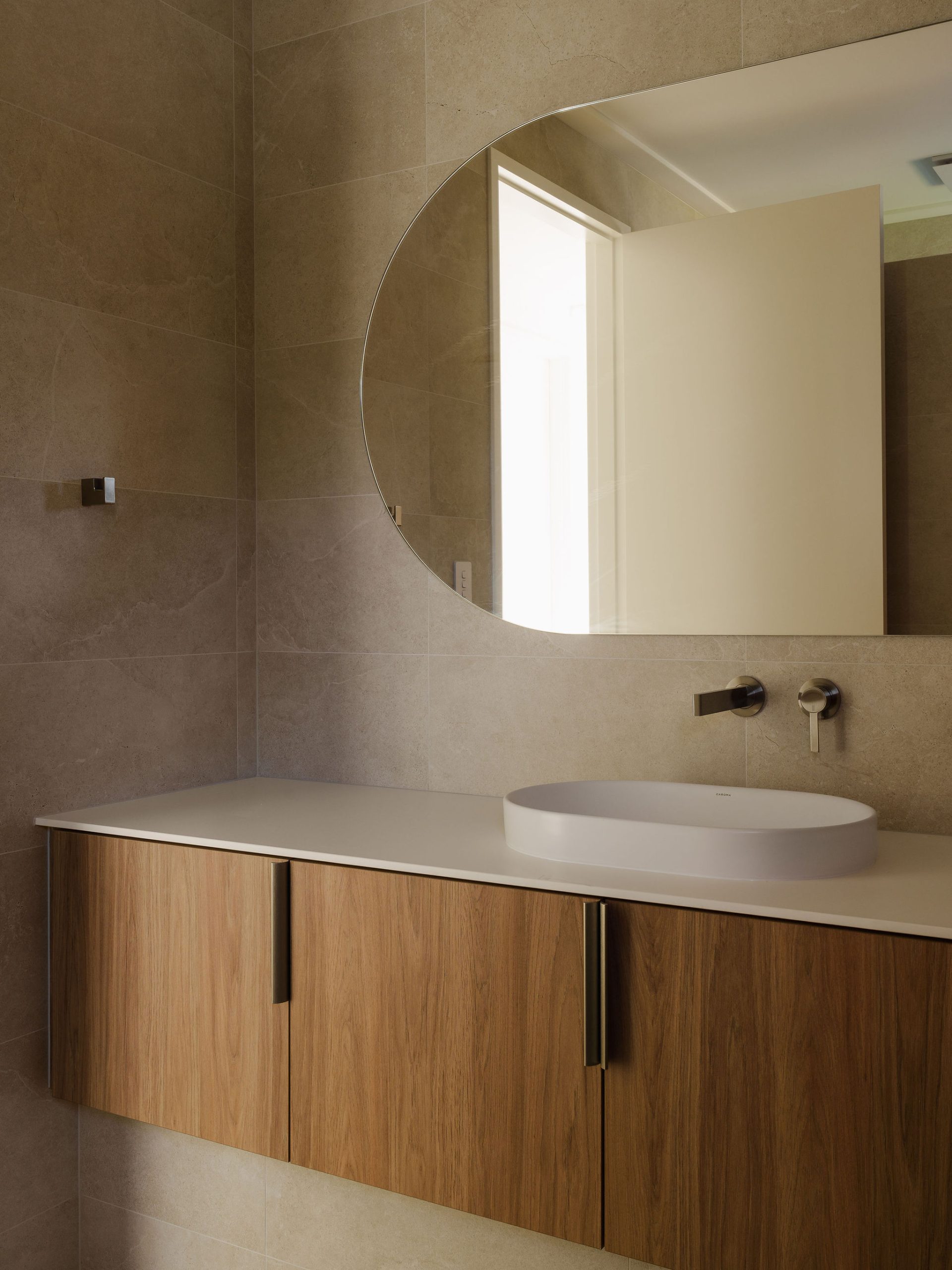 in a home where continuity is everything, the mood holds moving upstairs. bathrooms are wrapped in full-height stone-toned tiles that ground the space and keep the palette consistent. vanities float above the floor in pale timber, echoing the warmth of the lower level. and curved mirrors and vessel basins bring softness, while minimal tapware keeps the visual language tight and architectural.
