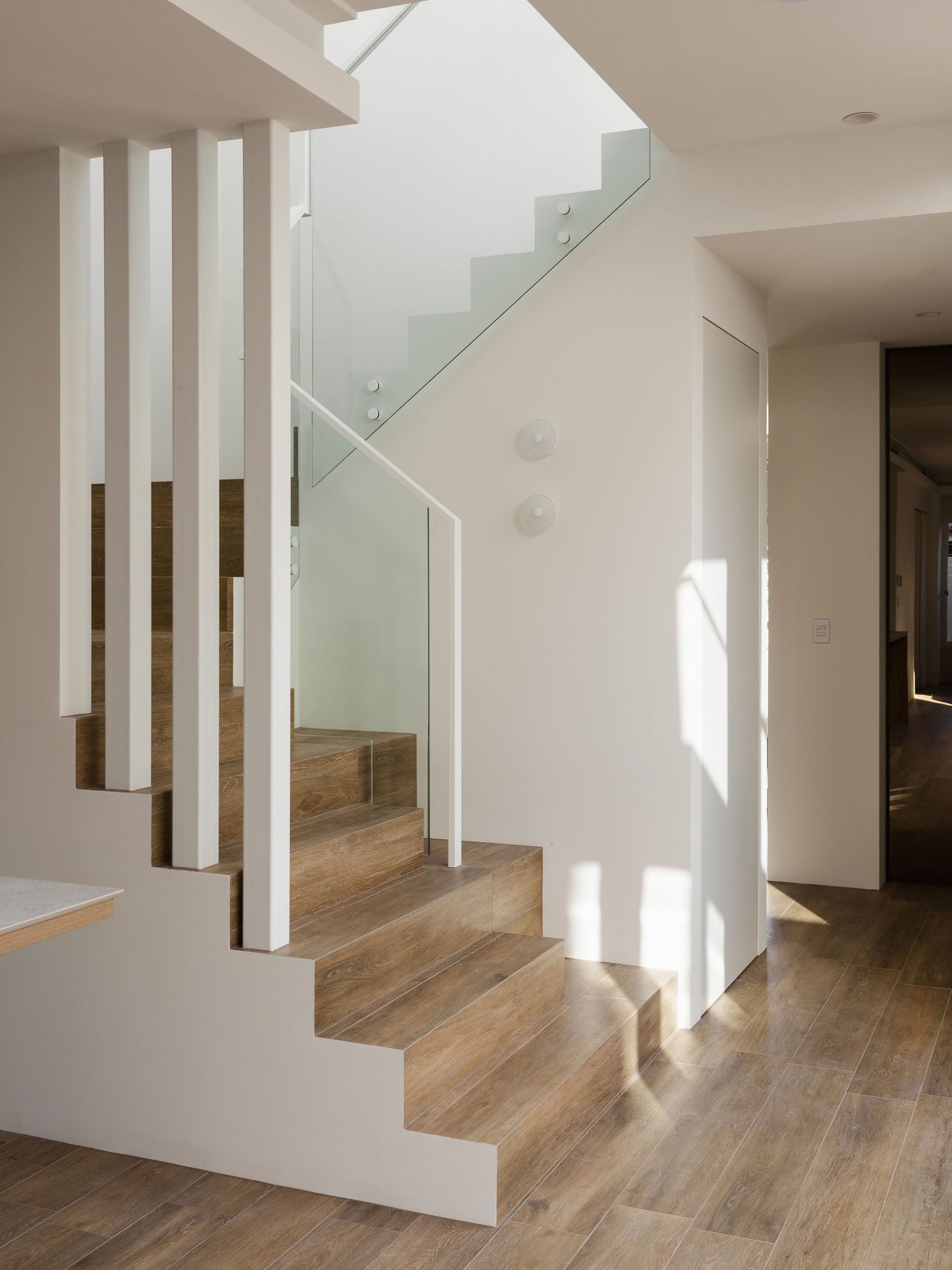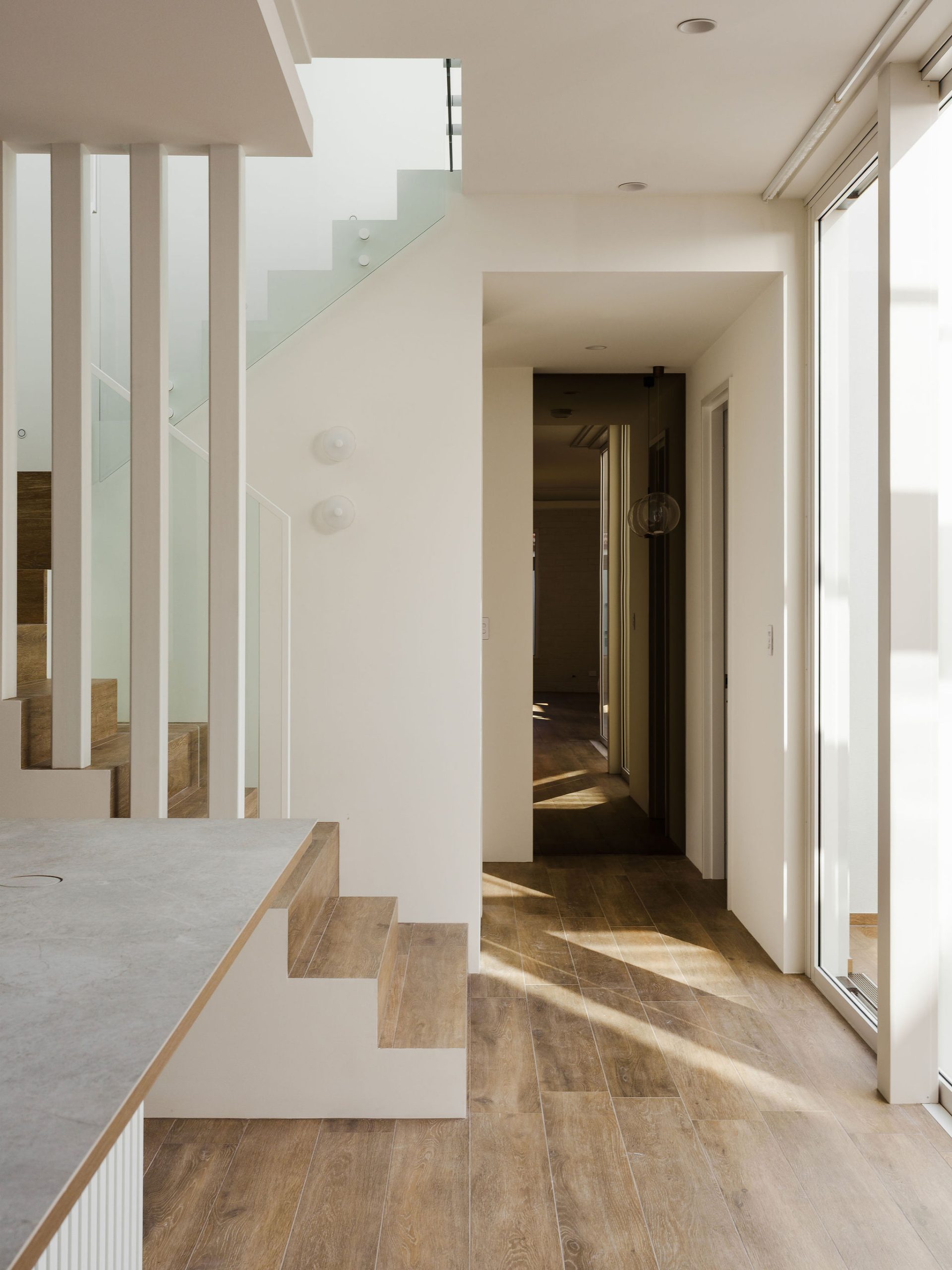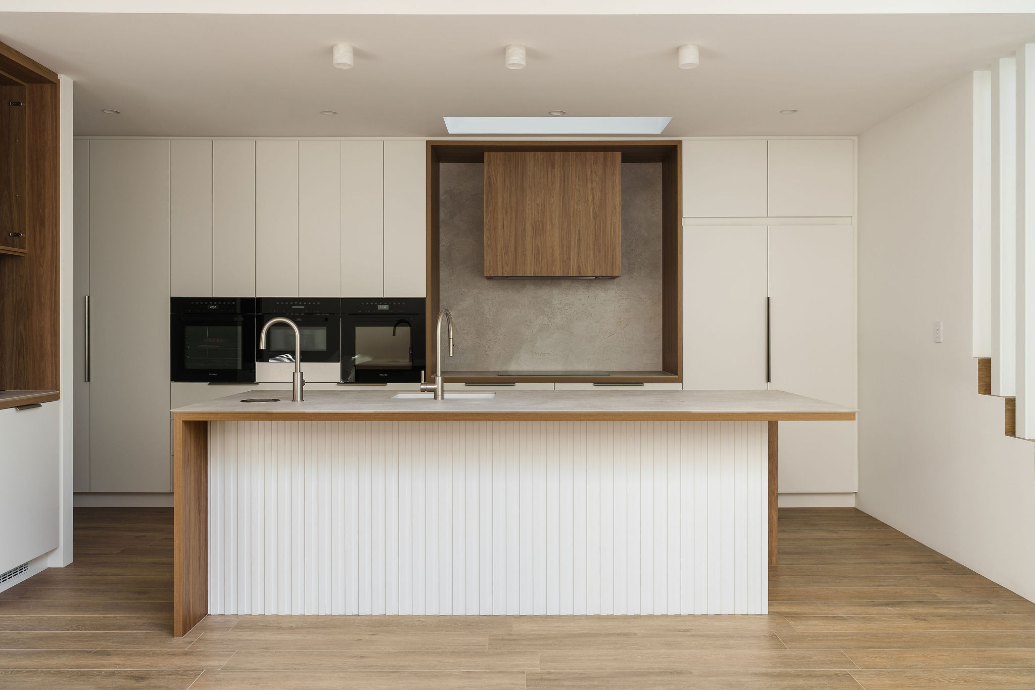 greeted by timber porcelin underfoot, guests are led inward past a staircase onto an expansive living area. anchored by a fluted island bench, project 085c kitchen is the elegant centre of the home – complete with full-height cabinetry receding cleanly into walls. delivering absent handles and hidden clutter, this tactile mastercraftsman architectural masterpiece is a testimony to the skill required turning vision into curated living.